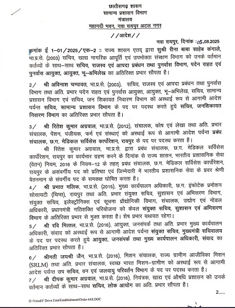 आईएएस रीना बाबा साहेब कंगाले, सचिव खाद्य नागरिक आपूर्ति एवं उपभोक्ता संरक्षण विभाग को उनके वर्तमान कर्तव्यों के साथ-साथ सचिव राजस्व एवं आपदा प्रबंधन तथा पुनर्वास विभाग, पदेन राहत एवं पुनर्वास आयुक्त, आयुक्त, भू-अभिलेख का अतिरिक्त प्रभार सौंपा गया है. आईएएस अविनाश चम्पावत, सचिव राजस्व एवं आपदा प्रबंधन तथा पुनर्वास विभाग तथा अति. प्रभार पदेन राहत एवं पुनर्वास आयुक्त, आयुक्त, भू-अभिलेख, सचिव, सामान्य प्रशासन विभाग एवं सचिव, जन शिकायत निवारण विभाग को अस्थाई रूप से आगामी आदेश पर्यन्त सचिव, सामान्य प्रशासन विभाग के पद पर पदस्थ करते हुए सचिव, जनशिकायत निवारण विभाग का अतिरिक्त प्रभार सौंपा गया है.