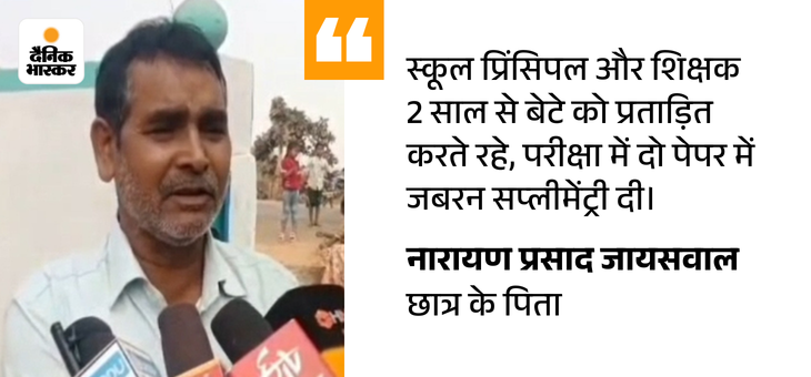 छात्र के पिता नारायण प्रसाद जायसवाल ने बताया कि स्कूल के प्रिंसिपल और टीचर मेरे बेटे को 2 साल से प्रताड़ित कर रहे थे। परीक्षा में बेटे को 2 पेपर में उसे जबरदस्ती सप्लीमेंट्री दे दिए। बेटे ने वहां पढ़ने से मना कर दिया।