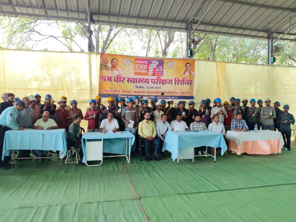चांपा। छत्तीसगढ़ राज्य के 25 वें स्थापना वर्ष (रजत जयंती वर्ष 2025 ) के तहत् आयोजित 15 अगस्त से 06 फरवरी 2026 तक आयोजित किये जा रहे है। विभिन्न आयोजन के परिपेच्छ में प्रथम चरण में दिनांक 12 सितम्बर 2025 को प्रकाश इण्डस्ट्रीज लिमिटेड, चांपा में श्रम विभाग के निर्देश में श्रम वीर स्वस्थ जांच किया गया जिसमें 376 श्रम वीर का जांच किया गया। शिविर में कारखाने के मुख्य चिकित्सा अधिकारी डॉ लोकेन्द्र लागर एवं उनकी टीम, कारखाना प्रबंधक श्री उदय सिंह एवं कर्मचारी राज्य बीमा निगम से डॉ मयंक मेश्राम एवं लेबर अफसर संदीप देवांगन, धनेन्द्र चंद्राकर, मनीष शर्मा के नेतृत्व में यह जांच शिविर पूर्ण किया गया।