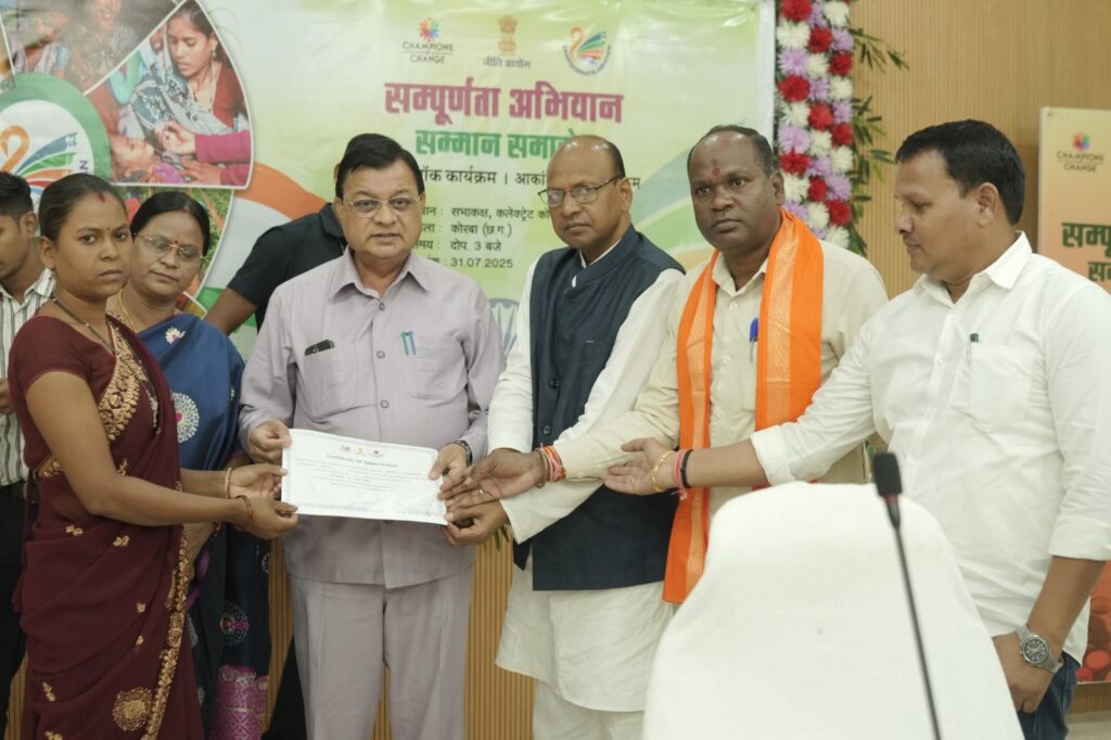 कोरबा,(CITY HOT NEWS)///नीति आयोग के तत्वावधान में संपूर्णता अभियान सम्मान समारोह कार्यक्रम का आयोजन आज कलेक्ट्रेट सभाकक्ष में किया गया। इस अवसर पर मुख्य अतिथि छत्तीसगढ़ शासन के वाणिज्य, उद्योग एवं श्रम मंत्री श्री लखनलाल देवांगन रहें।संपूर्णता अभियान आकांक्षी जिलों एवं ब्लॉकों के लिए एक ऐतिहासिक पहल रही, जिसका उद्देश्य प्रमुख 6 प्रदर्शन संकेतकों में पूर्णता प्राप्त करना था। कलेक्टर श्री अजीत वसंत के मार्गदर्शन एवं ब्लॉक अधिकारियों, स्वयं सहायता समूहों, फ्रंटलाइन वर्कर्स तथा विभिन्न विभागीय टीमों के समन्वित प्रयास से कोरबा ने आकांक्षी जिला कार्यक्रम के 6 में से 5 संकेतकों में उत्कृष्ट उपलब्धि प्राप्त की। कोरबा आकांक्षी ब्लॉक 6 में से 5 संकेतकों में शत प्रतिशत उपलब्धि वहीं पोड़ी उपरोड़ा आकांक्षी ब्लॉक 6 में से 4 संकेतकों में शत प्रतिशत उपलब्धि रही। इस सफलता पर कोरबा ब्लॉक को सिल्वर मेडल एवं पोड़ी उपरोड़ा ब्लॉक को कांस्य पदक प्रदान किया गया।