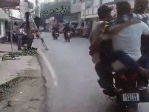 एक बाइक में एक-दूसरे पर लटककर की स्टंटबाजी।