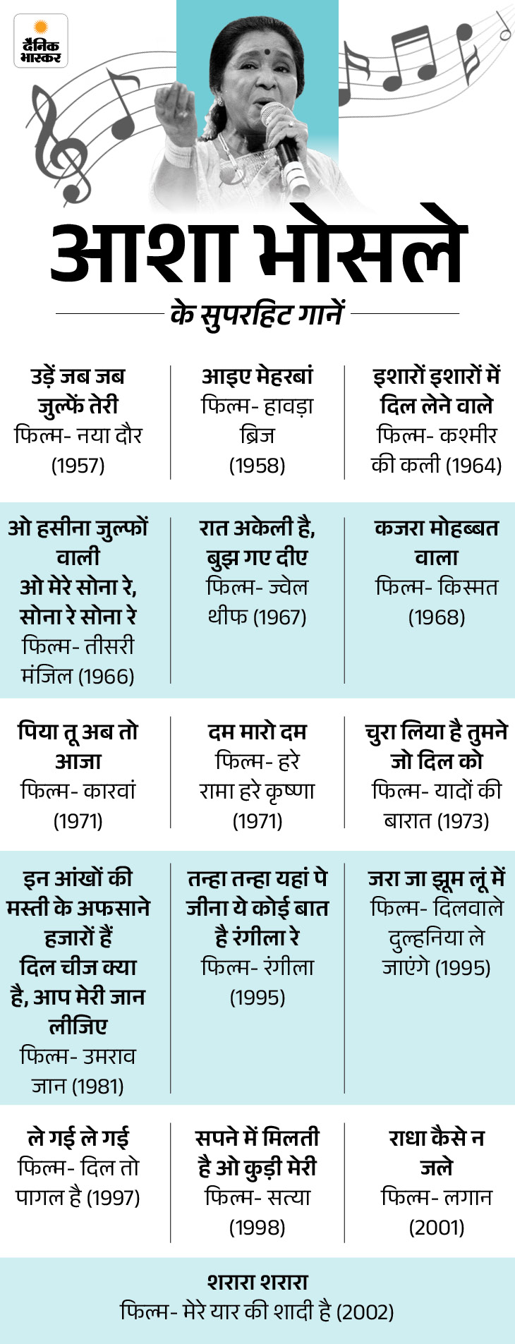 आशा महज 15 साल की थीं, जब उन्हें हिंदी फिल्म चुनरिया का सावन आया गाने का मौका मिला। उस दौर में नूर जहां, शमशाद बेगम जैसी सिंगर्स की इंडस्ट्री में पकड़ थी। लता भी धीरे-धीरे पहचान बना रही थीं, लेकिन आशा इस लिस्ट में कहीं नहीं थीं। उन्हें सिर्फ तब ही मौके मिलते थे, जब फिल्ममेकर्स या तो बड़ी सिंगर्स की फीस नहीं चुका पाते या दूसरी सिंगर्स इनकार कर देती थीं।