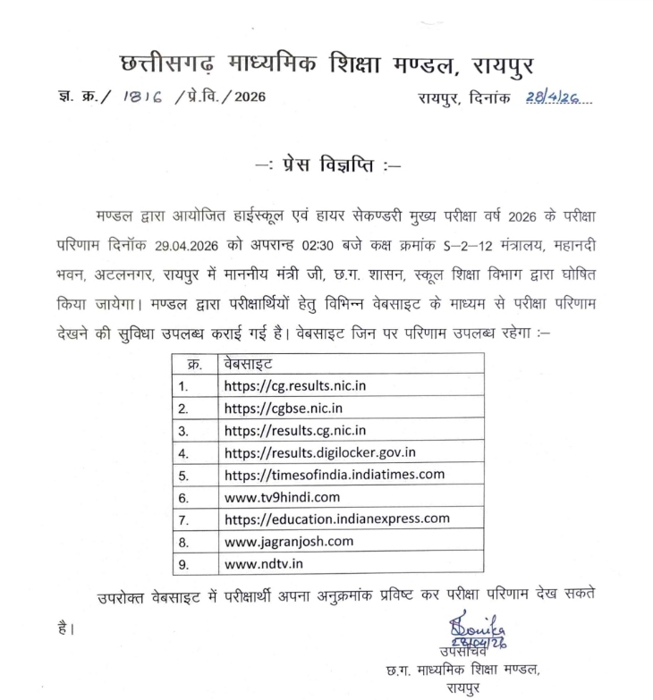 रायपुर/// छत्तीसगढ़ बोर्ड परीक्षा के नतीजे कल दोपहर ढाई बजे जारी होंगे। माध्यमिक शिक्षा मंडल हाई स्कूल और हायर सेकेंडरी के परिणाम औपचारिक रूप से घोषित करेगा। स्कूल शिक्षा मंत्री गजेंद्र यादव ने एक्स पर पोस्ट कर ये जानकारी दी।