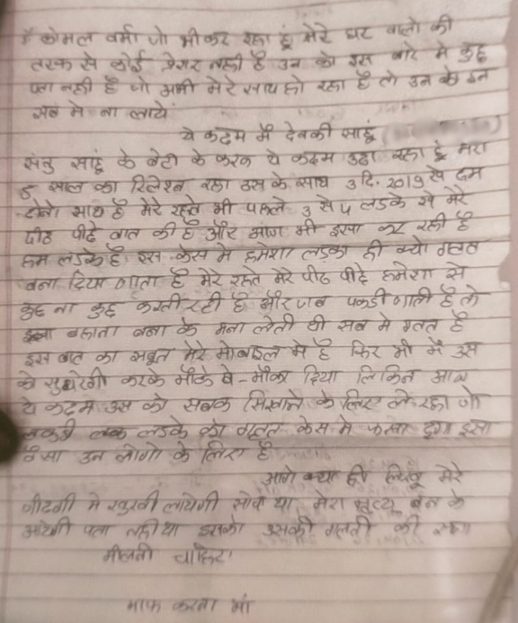 मैं कोमल वर्मा जो भी कर रहा हूं। मेरे घर वालों की तरफ से कोई प्रेशर नहीं है। उनको इस बारे में कुछ पता नहीं है। जो अभी मेरे साथ हो रहा है उसमें इनको इन सब में ना लाए।…ये कदम मैं देवकी साहू संतु साहू के बेटी के कारण उठा रहा हूं। मेरा 5 साल का रिलेशन रहा उसके साथ।