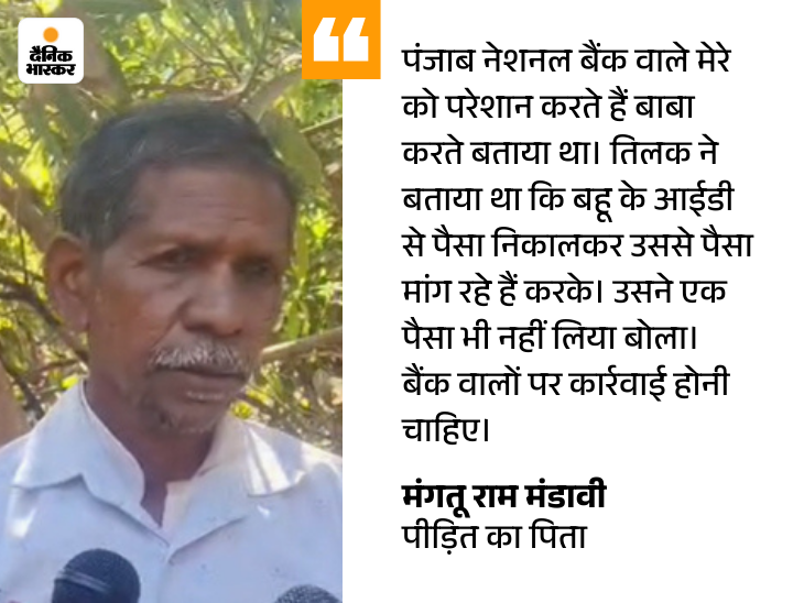 तिलक के पिता मंगतू राम मंडावी ने कहा कि, मैं खेत में काम करने गया हुआ था। मुझे जानकारी मिली कि उसने अपनी पत्नी का गला काट दिया है और वह फांसी पर लटका हुआ है। मैं दौड़े-भागे घर पहुंचा। तब तक उन दोनों को हमारी कार में बिठाकर अस्पताल लेकर जाने लगे थे। बेटा-बहू को बैंक के लोग परेशान कर रहे थे।